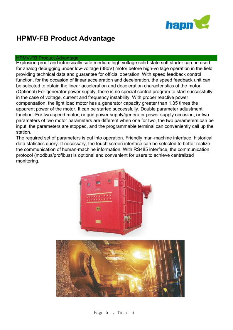 HPMV-FB explosion-proof and intrinsicallysafe high-voltage solid-statesoftstarteris a newhigh-tech electricalequipment designed based on the third-generation digital microprocessorcontrol technology and modern power electronic control technology. It is a soft start for mediumand high voltage large motors. Special equipment; can provide the best step-down current-limiting soft start mode for the motor. In order to adapt to different load conditions and achievebetter starting effect, HPMV-FB has designed a variety of control functions, which can smoothlyaccelerate the starting with the minimum current required to start the motor, thus effectivelyreducing the grid voltage drop at start-up. It reduces the current impact and mechanical shockduring starting; when soft stop is required, it can provide a gradual and gradually decreasingcontrollable voltage to the motor, and the motor drive system can be stopped smoothly.