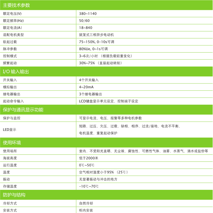 對(duì)電網(wǎng)及機(jī)械設(shè)備沖擊小等優(yōu)點(diǎn),是傳統(tǒng)起動(dòng)方式理想的更新?lián)Q代產(chǎn)品。適用于石油、冶金、礦山、選煤廠含有爆炸性氣體(甲烷)和煤塵的煤礦井下的重載或使用條件惡劣的三相異步電動(dòng)機(jī)的軟起動(dòng)、軟停車(chē)控制。